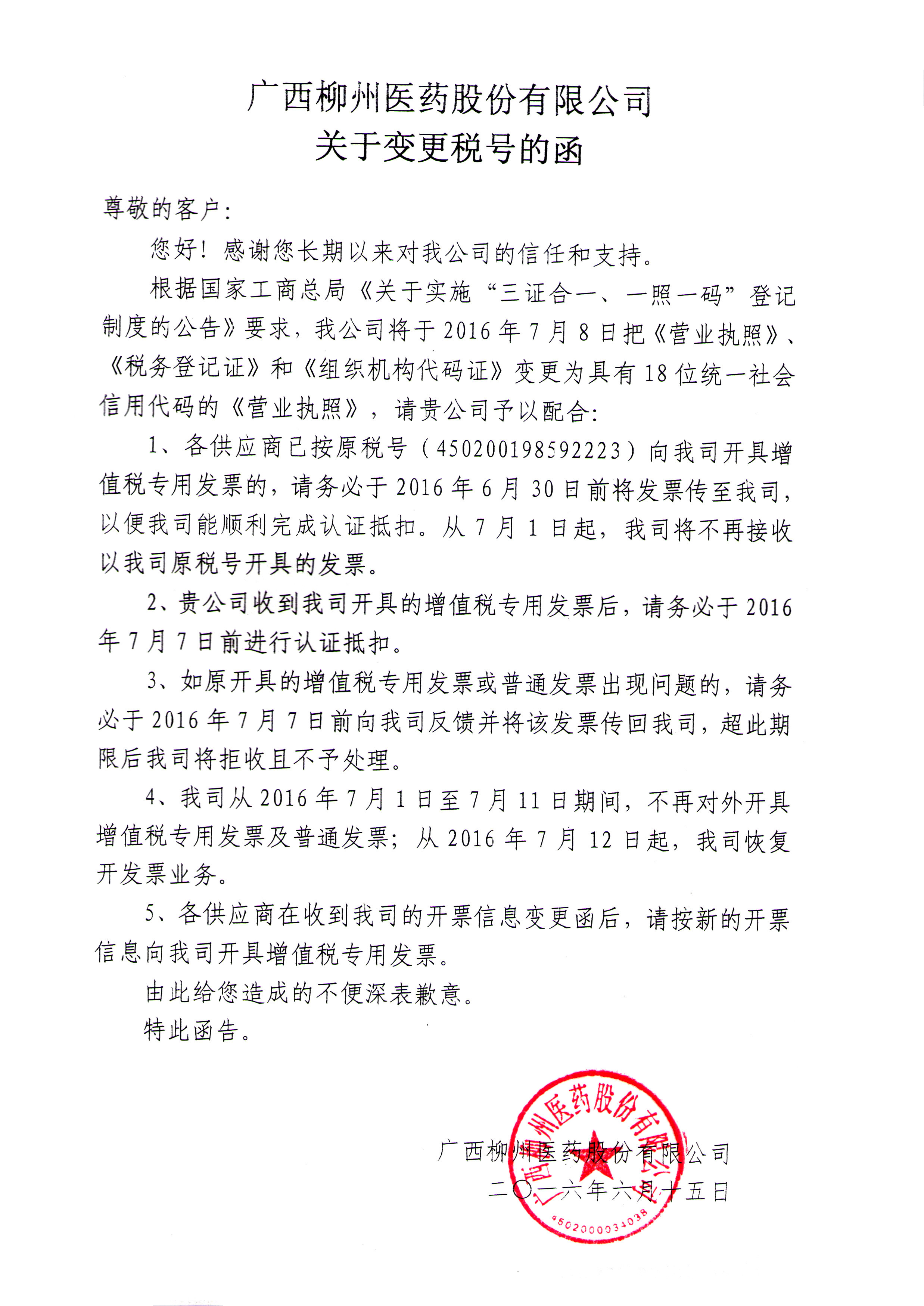 柳州医药关于变更税号的函
